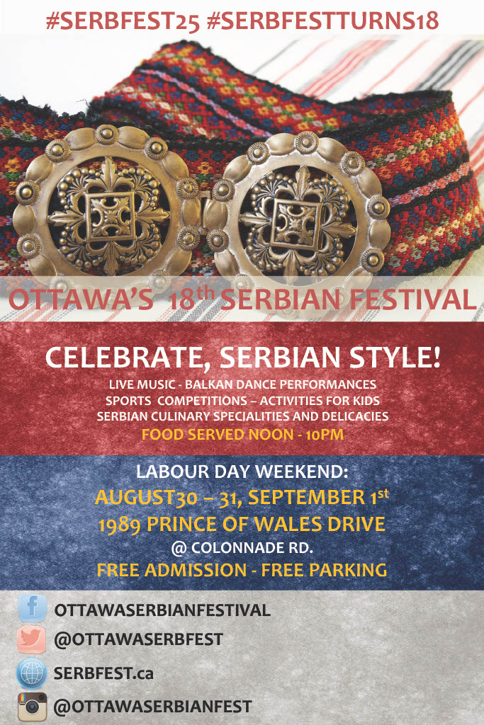 Не пропустите још један Српски фестивал у канадској престоници! Прва два дана дружење је продужено до 23ч. Ове године имамо и бесплатни паркинг. За све информације посетите фестивалски сајт.