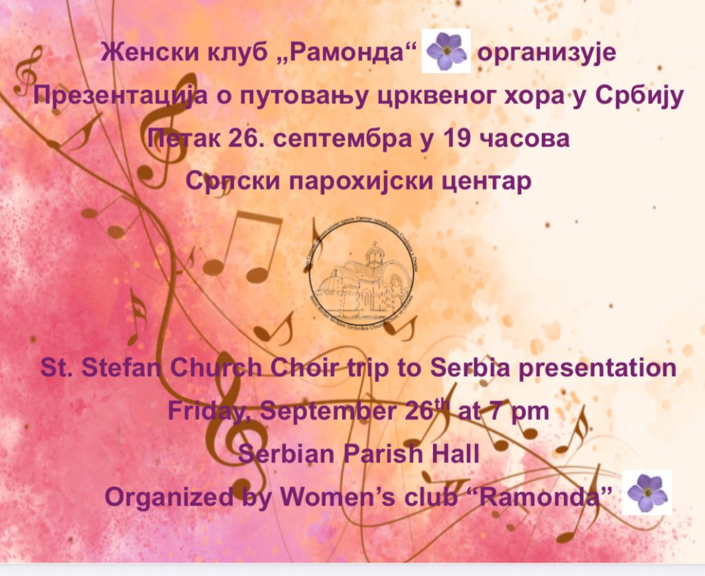 У име Хора цркве Светог архиђакона Стефана из Отаве и женског клуба „Рамонда“, који ће се побринути за организацију вечери, позивамо вас на презентацију посете хора српским црквама и манастирима у Србији.
